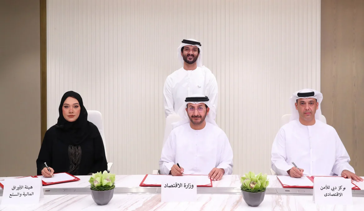 The MoU was signed by H.E. Abdullah Ahmed Al Saleh, Undersecretary of the Ministry of Economy; H.E. Dr. Maryam Butti Al Suwaidi, CEO of the Securities and Commodities Authority; and H.E. Faisal Yousef bin Sulaitin, Executive Director of the Economic Security Center of Dubai.